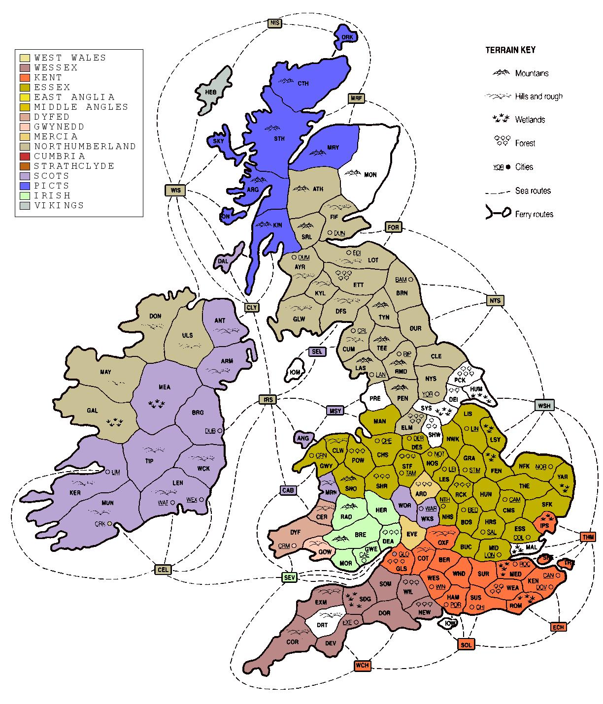 Dark Age is a game of power and conflict in Dark Age Britain. The game system is simple and straightforward, with plenty of scope for skill and skullduggery, combining the finesse of Diplomacy and the fluidity of Risk. To win the game you must expand your population to become the dominant kingdom of Britain. Only warfare will provide the room for your population to grow, but only peace will allow you to secur eyour gains. Wars must be decisive, and your diplomatic efforts may be the key to victory.